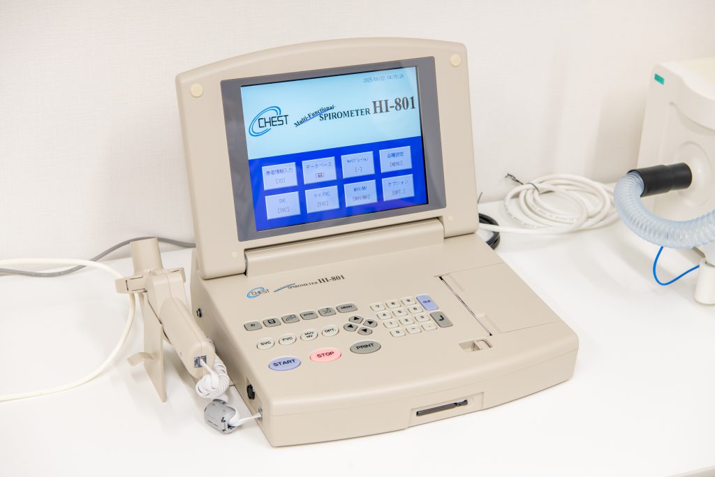 呼吸機能を測定する装置です。息を吸ったり吐いたりする力や量を調べることで、喘息やCOPD(慢性閉塞性肺疾患)などの呼吸器疾患の診断や経過観察に役立ちます。