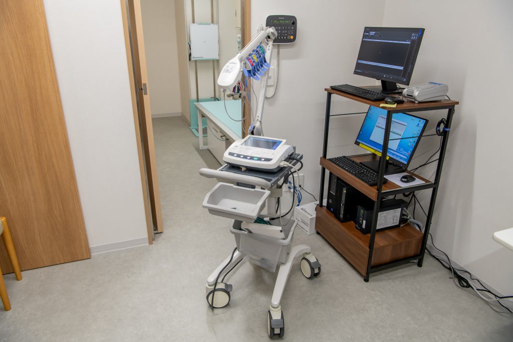 心臓の電気的な動きを記録し、不整脈や虚血性心疾患などの有無を調べるための検査装置です。電極を体に装着して短時間で測定でき、その場で結果が確認できます。
